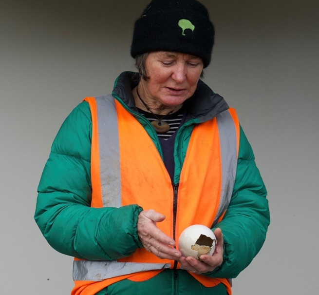 Jo Halley, Paparoa Wildlife Trust, with a kiwi egg