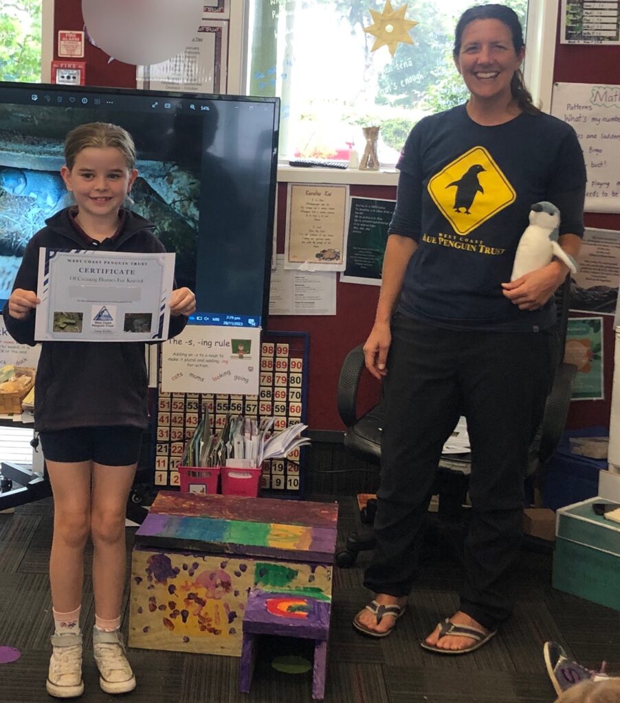 George Atfield's year 3/4 wonder class at St Canice's School in Westport take action for penguins! We had a fun day at the school building nest boxes for little penguins and we were ever so grateful for the generous support we received from whānau and local community. The students did so well with drills, hammers, nails and lots of paint, successfully building twelve nest boxes for the trust to put out where needed in the local colonies for next season. There were no blue thumbs in the process either! We would like to say a big thank you in particular to Laurie Cockfield, Milah's Grandad, who built seven penguin boxes at his house, two of which he funded himself. We would also like to say a big thank you to Jake Orchard (Louie’s Dad), Chris Kennard (Hudson’s Dad) and John Noble (Hadley’s Dad), who all took a group and helped out on the day.Our very grateful thanks go to Steve Atfield at Vetpak, who sponsored the materials for ten boxes.