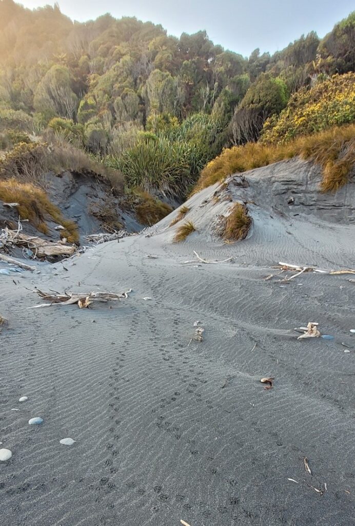 The West Coast Penguin Trust has maintained an active interest in the Ōkārito kororā colony since it was first surveyed in 2008 and has resurveyed the colony every few years since then. In late October Linden resurveyed the colony for the first time since 2018. Unlike most kororā colonies on the West Coast, the penguins here are safe from dogs and cars, and human disturbance and the effect of introduced predators are minimal; it is little surprise that the penguin colony here is the largest on the West Coast. Stepping onto the beach it is obvious that there are a lot of penguins; the sand is almost continuously criss-crossed by penguin tracks! Almost a step back in time to what things would have been like before humans and introduced predators.