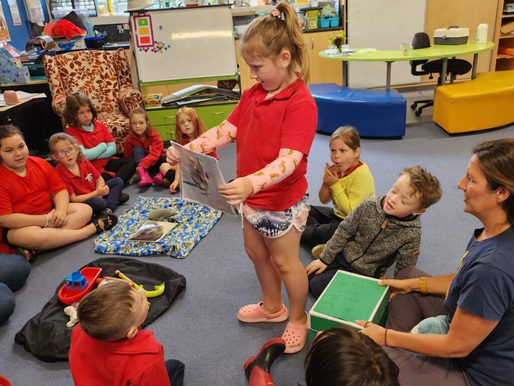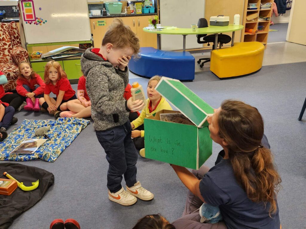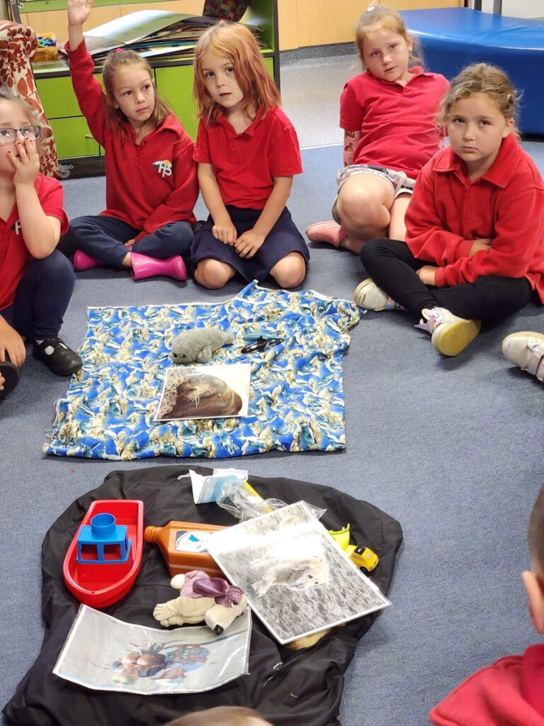 After our very successful trip to the beach a few weeks ago, where the students trained their Penguin Ranger skills, to be able to “Stop, Look, Listen, Freeze” when searching for penguins, Hokitika Primary’s Rūma Piwakawaka, year 2 class played a session of What’s in the box with Education Ranger, Lucy Waller, last week, to round off their penguin journey for the year.